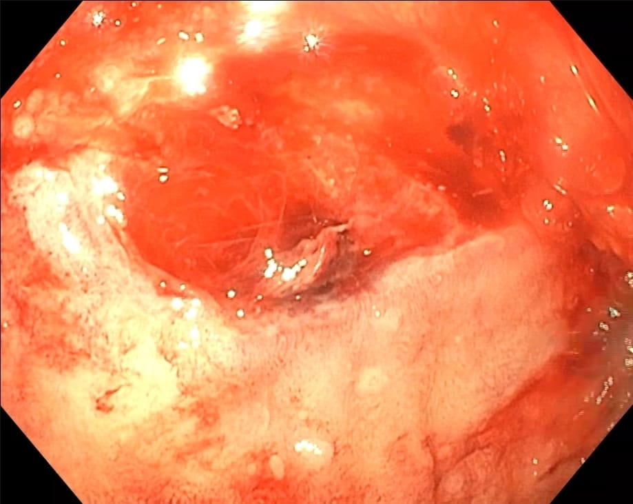 Endoscopy performed on the 7th day after admission (hematemesis in large quantities):