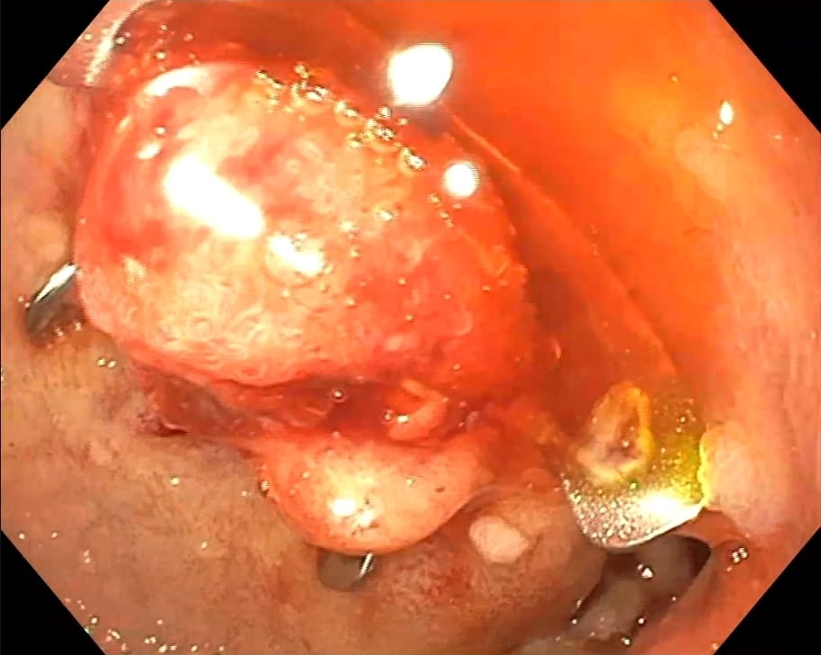 Definitive long term hemostasis was achieved with an over-the-scope-clip (OVESCO) as it not only remains attached to the mucosa for a long period (multiple weeks), it grips a much larger area compared to the standard through-the-scope clips.