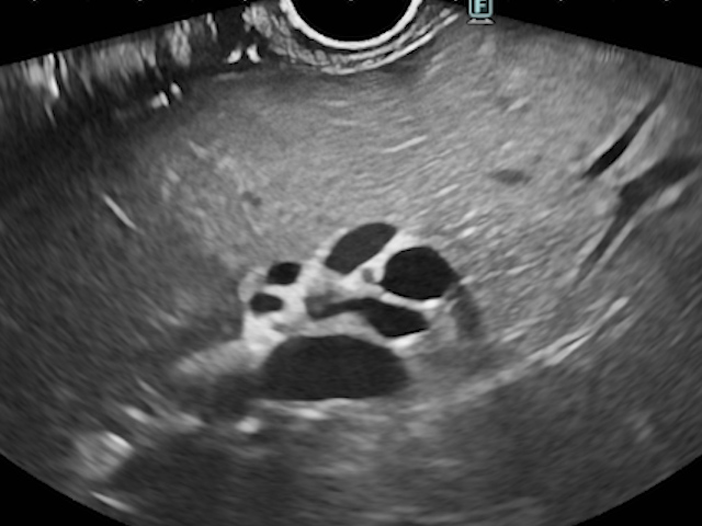 Linear-array endoscopic ultrasound (EUS) was performed to assess the feasibility of drainage and to exclude other causes of cholestasis.