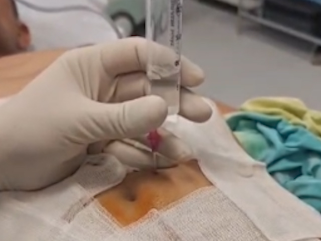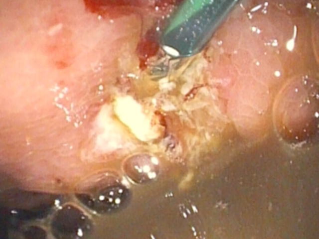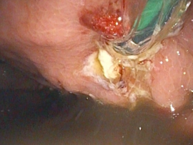 An EUS-guided CGA was performed using a plastic pigtail stent. Under deep sedation and endotracheal intubation, the collection was punctured with a 19G FNA needle, and the aspirate, with a brownish appearance typical of a pseudocyst, was sent for biochemical and microbiological analysis (Fig. 4).