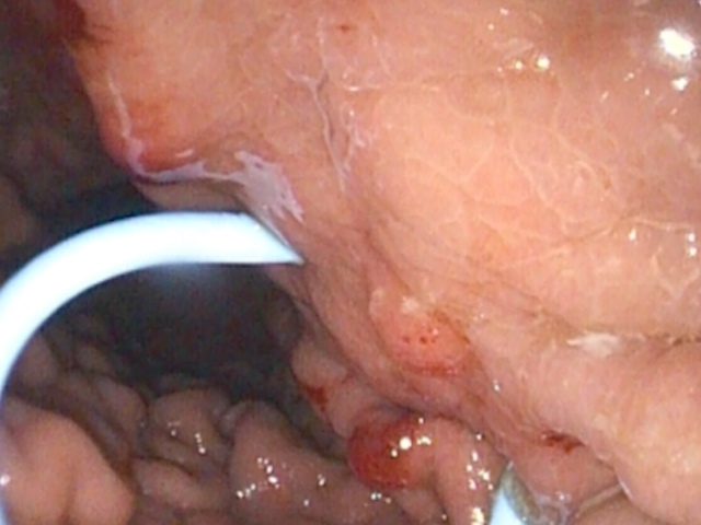 This case demonstrates the efficacy of EUS-guided drainage of a cephalic pancreatic pseudocyst with a plastic stent, the safety of conservative management of minor pneumoperitoneum, and the importance of stent selection based on the content of the collection, in accordance with ESGE guidelines.